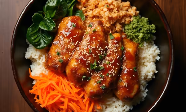 Лосось в глазури терияки, тёплый рис, авокадо, эдамаме, нори, огурец, соус понзу.
