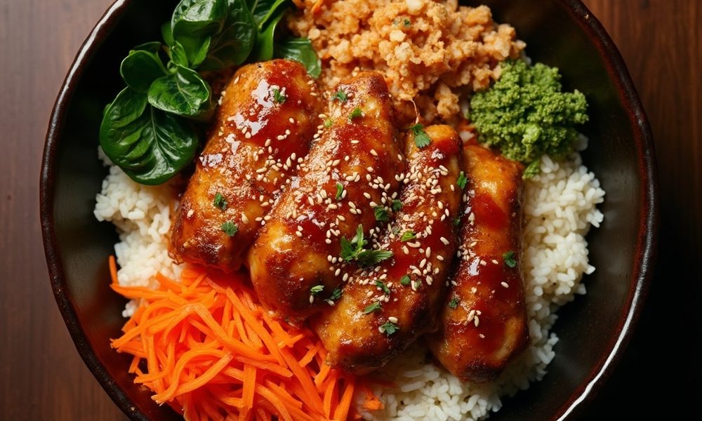Рис с кунжутным маслом, пульгоги курица, кимчи жареное, морковь-ча, шпинат намуль, соус янъём.